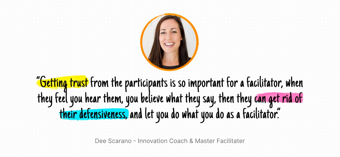 Facilitators commonly encourage participants to trust the process. Yet, a vital aspect that is sometimes missed is the facilitators’ need to establish trust with participants upfront. Cultivating this trust entails connecting with them, showing empathy, addressing their concerns, and making it evident that your support is available. This underscores the importance of early workshop moments, such as the preparation call, in fostering this trust. Once established, participants find it more natural to trust the process.