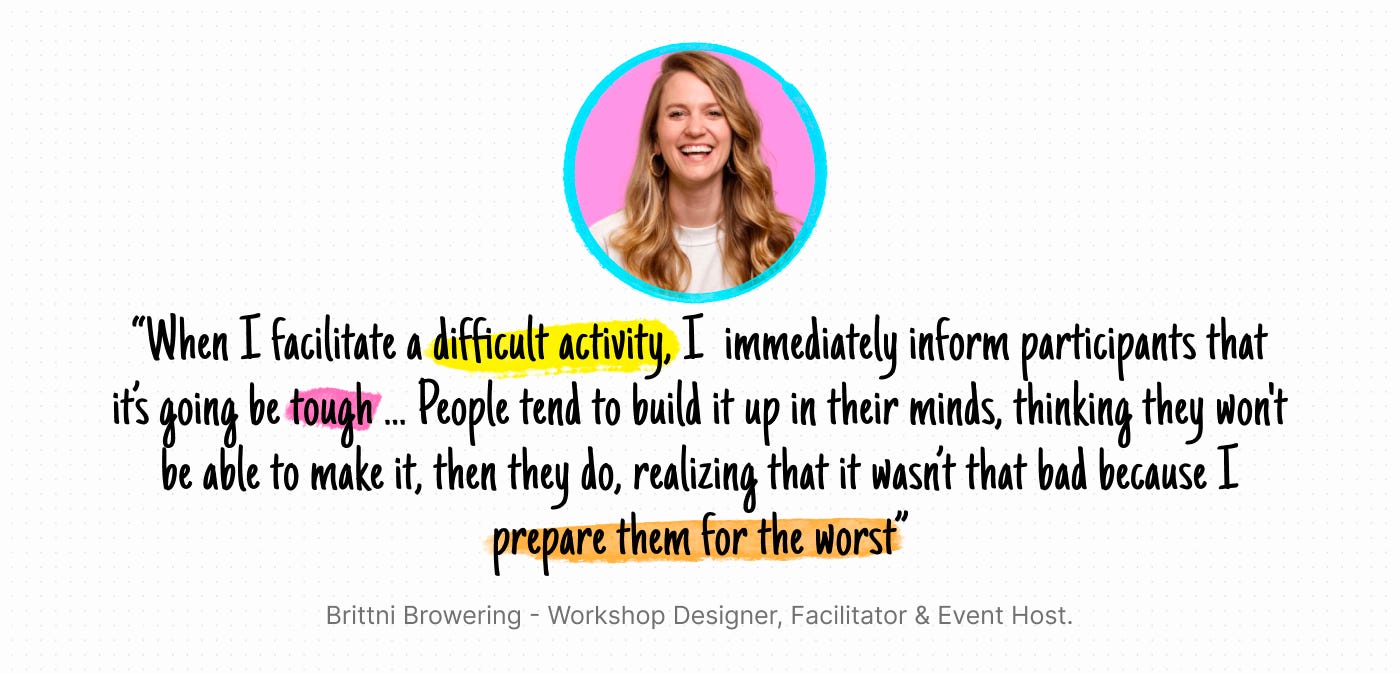 Managing participants’ expectations is the most important thing to ensure a seamless workshop. However, this shouldn’t be a one-shot effort at the start of the workshop but a continuous one throughout the entire session, even within specific activities. Priming participants for potential challenges equips them to face adversity with greater focus and ease. By setting expectations for the worst, they become mentally prepared, allowing them to manage such situations better.
