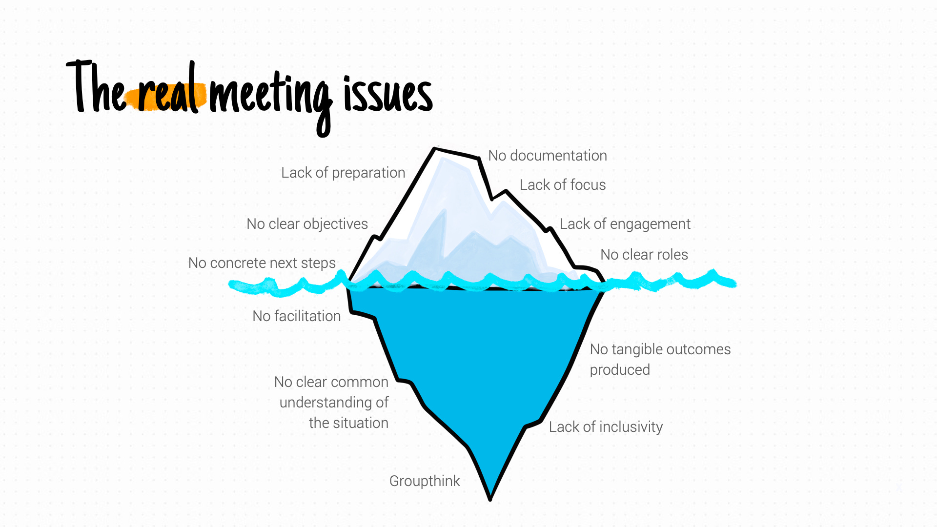 These tips might work but they are not a game changer. Most of the meetings will still suck. “Why is that?” I’m happy you asked. It is simply because those tips are just a band-aid fix for some symptoms of these meeting issues (top of the iceberg), but they are not solving the real deep ones (below the sea level).