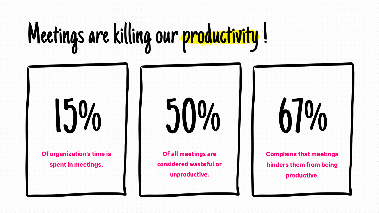 Nowadays, one of the biggest issues in the corporate world is meetings. Middle managers spend 35% of their time in meetings, without mentioning the number of hours spent to prepare those meetings when they are prepared.